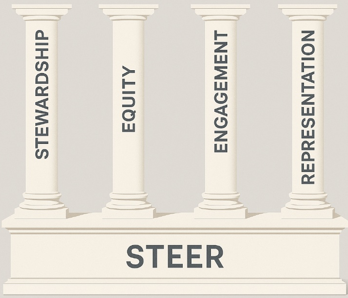 These four principles make up the acronym STEER - Stewardship, Equity, Engagement, and Representation. The principles serve as the foundation for progressive action, steering us towards becoming a more progressive society.